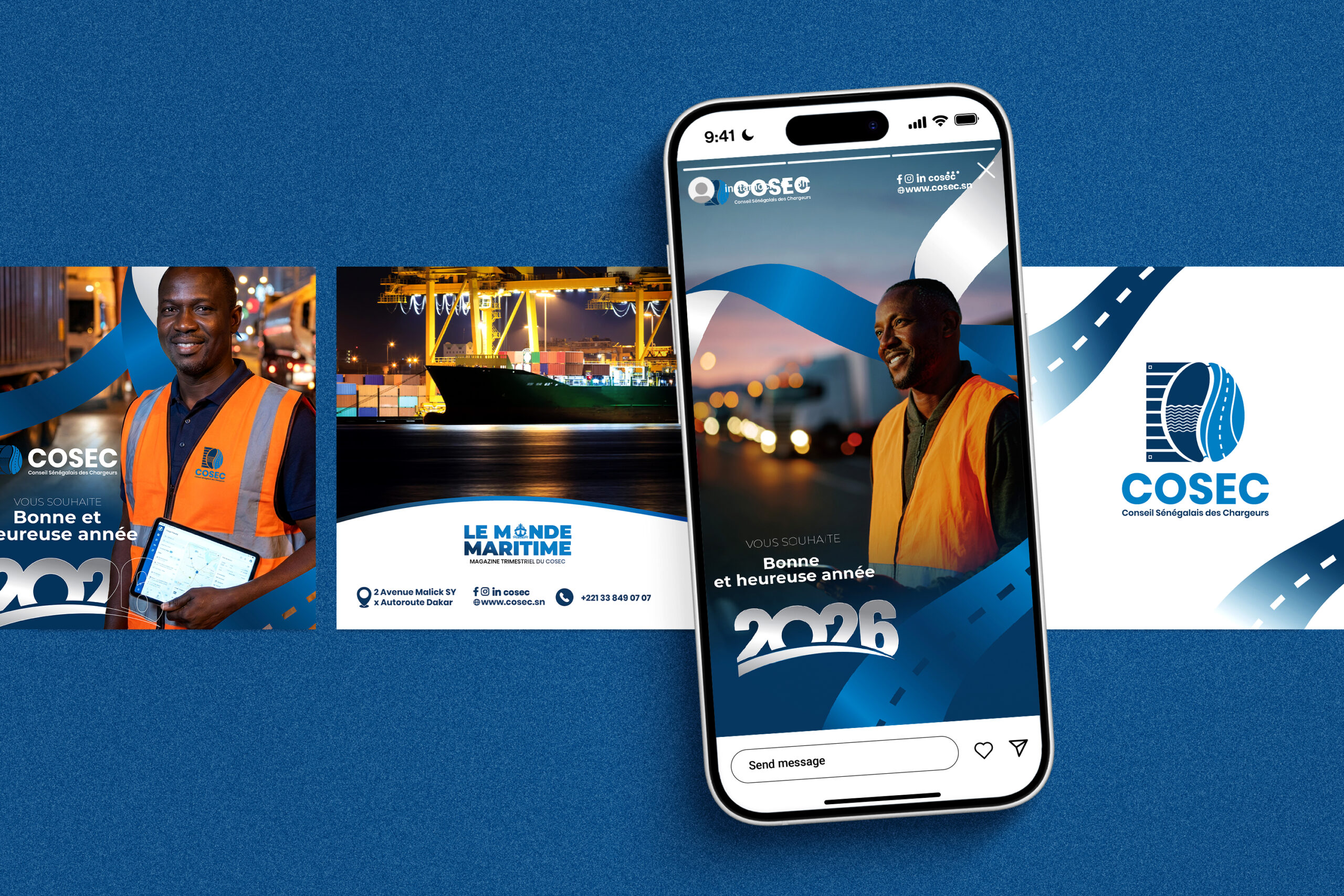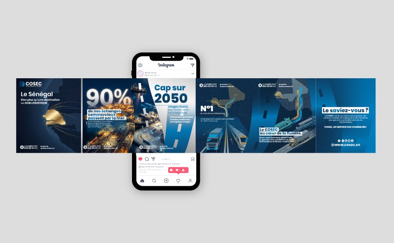 À travers cette réalisation, Eyaid’n Company a conçu un dispositif de communication visuelle moderne et structuré pour le COSEC, alliant supports print et digital. L’ensemble met en scène une identité graphique cohérente, portée par des visuels professionnels, une palette chromatique maîtrisée et une direction artistique alignée avec les codes du secteur maritime.