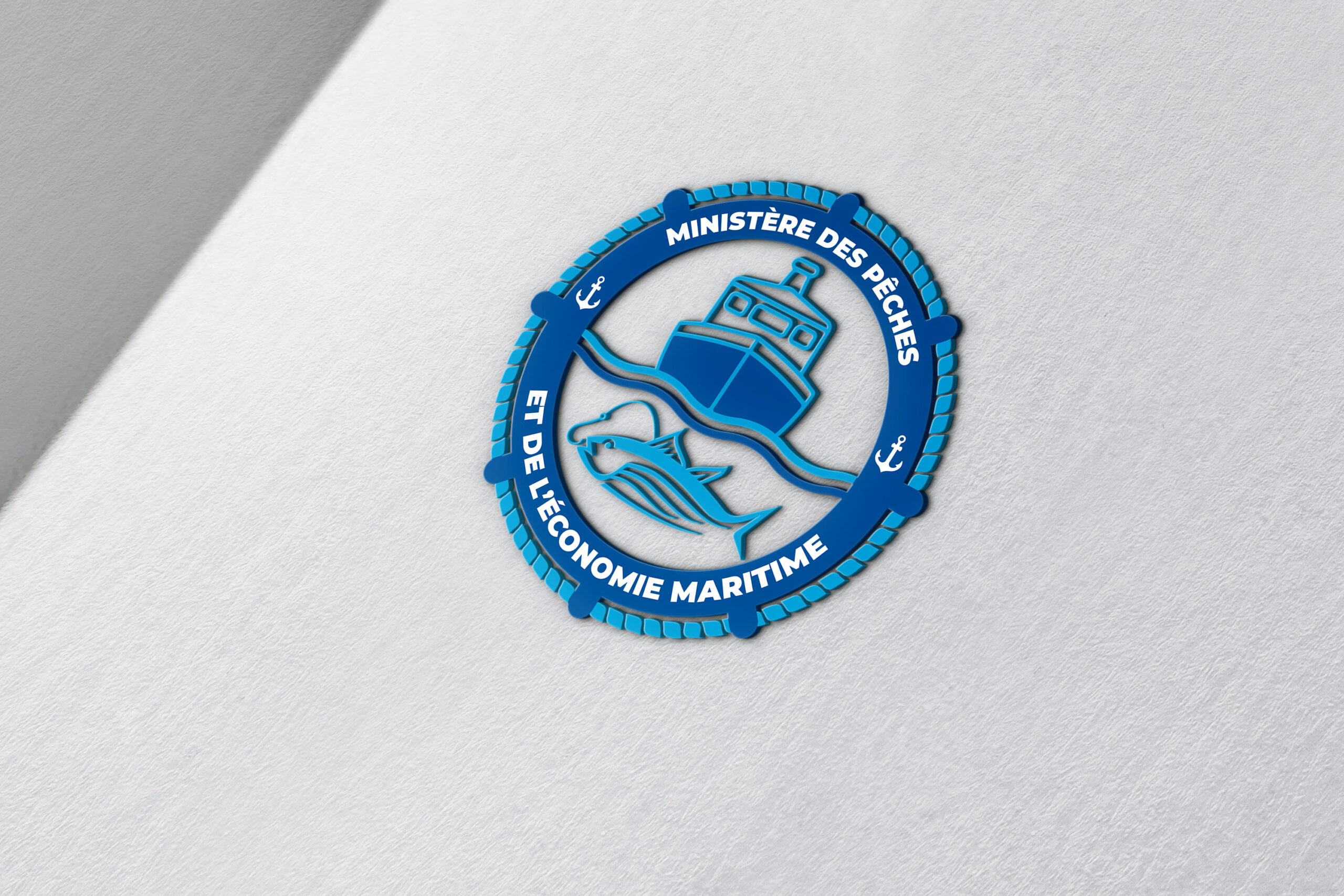 Ce visuel met en avant une interprétation en relief du logo du Ministère des Pêches et de l’Économie Maritime, avec un effet 3D moderne. La composition circulaire, intégrant des éléments maritimes (navire, poisson, ancre), traduit clairement l’univers sectoriel. Le traitement en dégradé bleu renforce la dimension institutionnelle, tout en apportant modernité et lisibilité.
