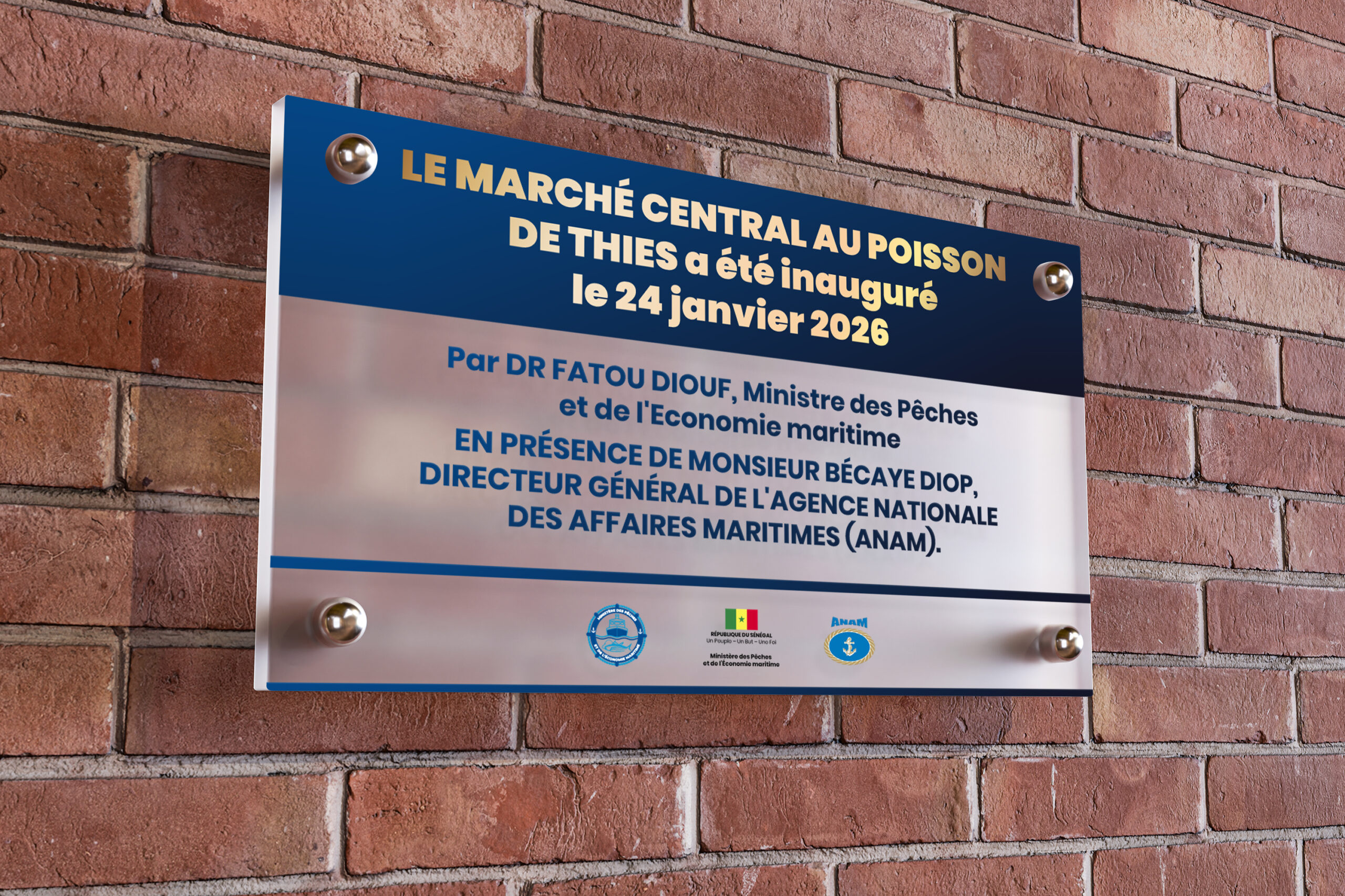 Ce support se présente sous forme d’une plaque inaugurale murale, conçue pour marquer un événement officiel. La composition repose sur une structure claire avec un bandeau titre, un contenu central et des logos institutionnels en pied. Les fixations apparentes et la finition rigide confèrent au support une dimension durable, solennelle et représentative.