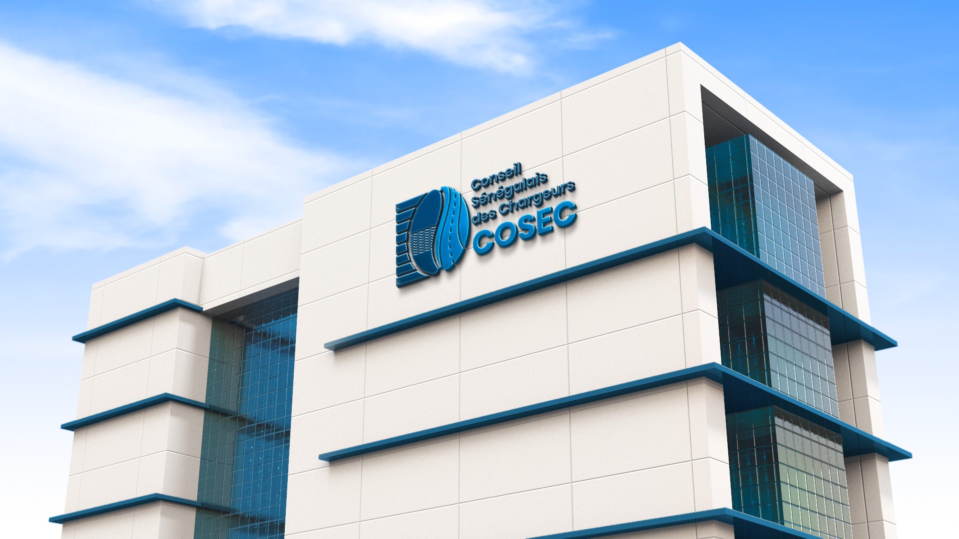 Ce visuel présente l’intégration du logo du COSEC en lettres 3D fixées sur la façade d’un bâtiment moderne. Le traitement en relief, associé à une teinte bleue cohérente avec l’identité visuelle, renforce la visibilité et le caractère institutionnel. Ce type de support permet une présence durable et prestigieuse, inscrivant la marque dans l’espace urbain avec autorité et crédibilité.