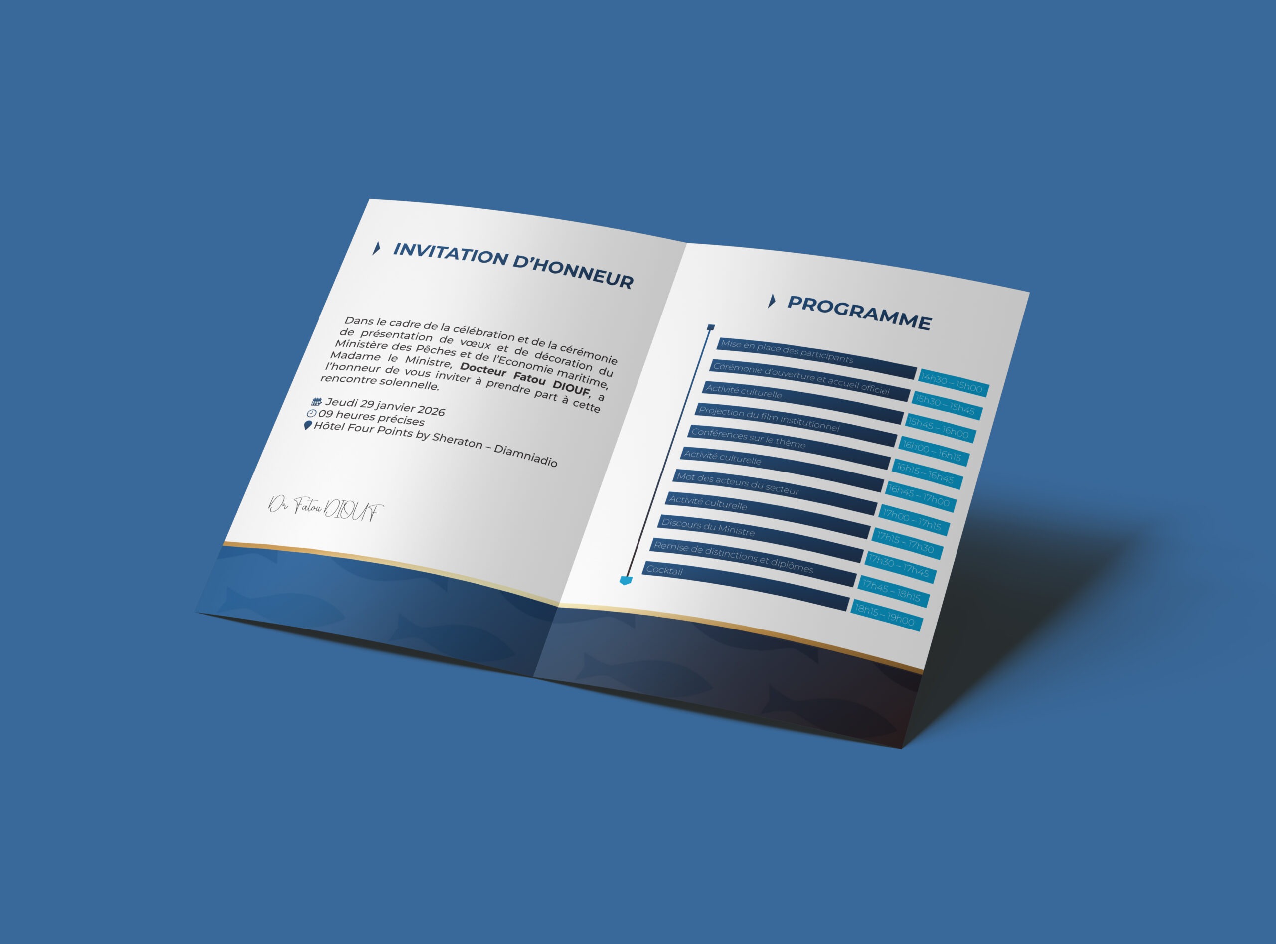 Ce visuel illustre une invitation institutionnelle au format plié, conçue pour une cérémonie officielle. La mise en page est structurée avec une hiérarchie claire entre le message d’invitation et le programme détaillé. L’usage de couleurs sobres, de typographies élégantes et d’éléments graphiques maritimes renforce le caractère formel et professionnel du support.