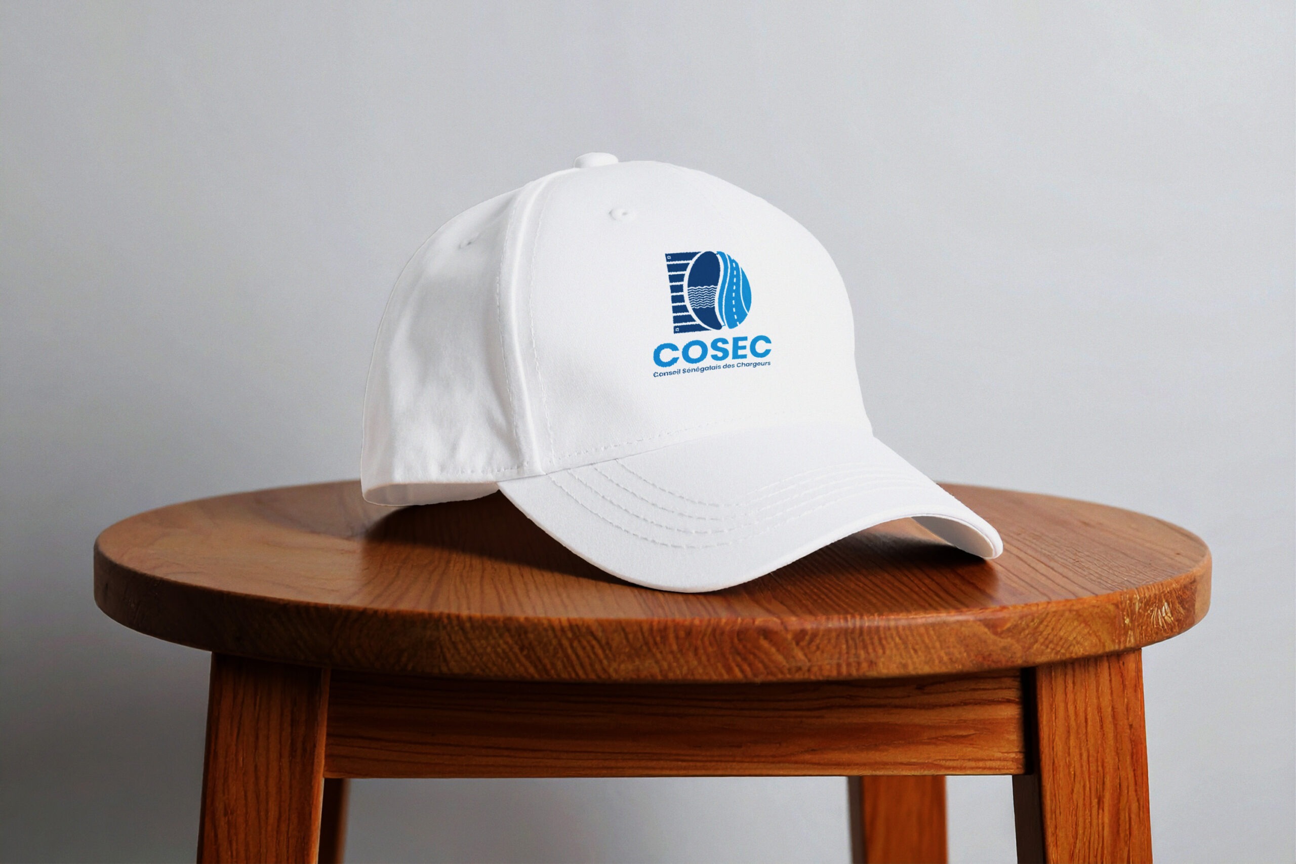 Ce support se présente sous forme d’une casquette textile blanche de type baseball cap, conçue en coton ou matière équivalente, avec une visière incurvée et une structure souple à six panneaux. Le design est volontairement épuré afin de mettre en avant le logo du COSEC, imprimé ou brodé en bleu au centre du panneau frontal.