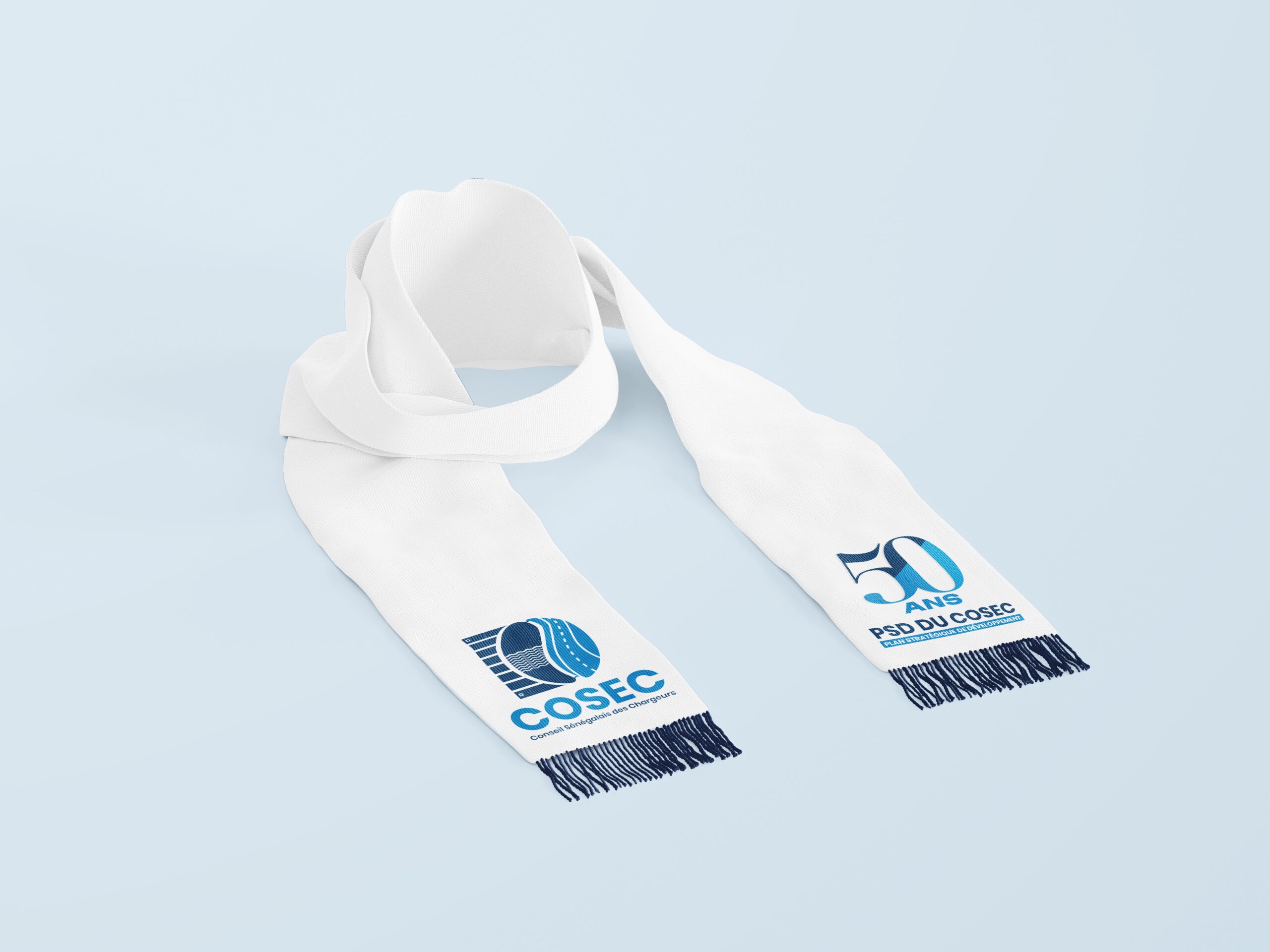 Ce visuel illustre une écharpe institutionnelle blanche personnalisée, intégrant le logo du COSEC et une mention commémorative (50 ans). Les extrémités sont finies avec des franges, renforçant l’aspect protocolaire. Ce support est destiné à des événements officiels, cérémonies ou représentations, combinant élégance et visibilité de marque.