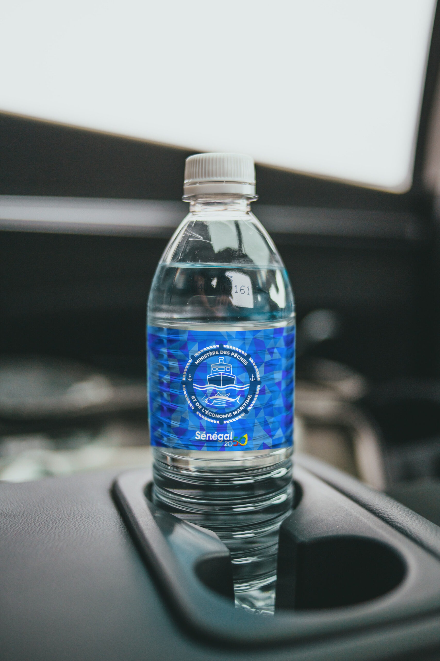 Ce support présente une bouteille d’eau personnalisée, habillée d’une étiquette aux motifs graphiques dynamiques dans des tons bleus. Le logo du ministère et la mention Sénégal 2050 sont intégrés pour renforcer la dimension stratégique et prospective. Ce type de support est idéal pour les événements officiels, alliant utilité et visibilité de marque.