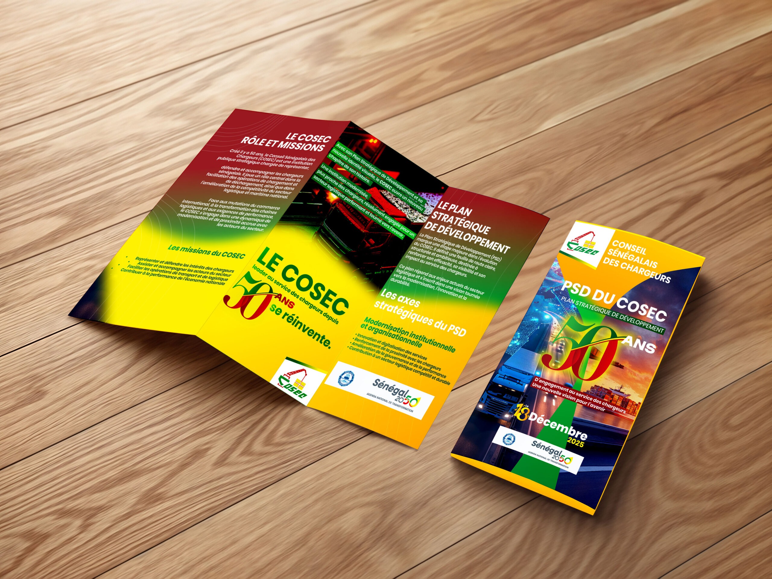 Ce support se décline en brochure pliée (type dépliant 3 volets) mettant en avant le plan stratégique du COSEC. La composition graphique associe couleurs vives, visuels sectoriels et hiérarchie claire de l’information, facilitant la lecture. Ce format est conçu pour informer, structurer le discours institutionnel et accompagner les prises de parole officielles.